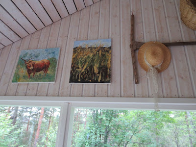 Tänä kesänä ripustin vuosien aikana tehdyistä maalauksistani pienen näyttelyn ateljeen seinille. Muutoin tämä kesähuone on pysynyt samanlaisena kuin aiemminkin ja täällä vietetään edelleen kesäiltoja hyvän ruoan merkeissä.